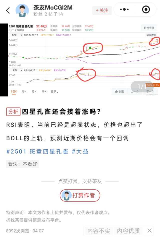 之前分析过四星孔雀已经达到超卖状态,价格将会有所回调。果然,最近几天报价都已经开始跌下来了。
