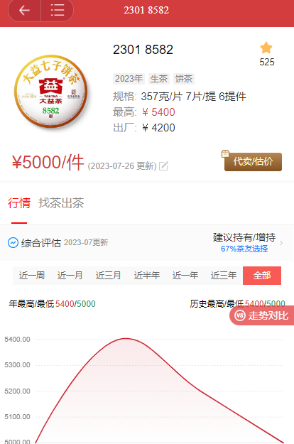 1985年,勐海茶厂研制成功了8582青饼。当年,这款茶专供香港蓝天贸易公司,是与7542同样著名的配方产品。 由于其成熟的里茶原料、相对较少的果胶含量、相对较弱的粘性和茶条之间较大的空隙,以及与空气充分接触,这款茶更容易陈化。8582的特点是,它是一款生茶,出厂价和市场价都很实惠,口感甜润,带有蜜香。据市场传闻,声名远扬的88青就是8582。 个人理解:这款茶安全可靠,上次的21年8582目前市场价在140元左右,这还算上前几天因为2301 8582发布火了一把涨了几百块呢,8582属于消耗茶,没有太多价格下调的空间。它并不是热门投资产品,短期预期获利空间也不会很大。不用担心存储品质问题。由于单价低廉,适合所有普洱茶投资者,特别是初次投资普洱茶的朋友。 本次2301 8582的上市,说的再怎么天花乱坠,市场空军再多也不能上升到金融博弈战的份上,大益拿出来就是维稳市场的,目前还需要持续观察,以确定行情回调后是否会出现新的拐点。
