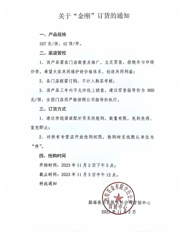 2301 金刚熟茶在厂庆11.1日正式发布,封面八宝 吉祥为世间、为天下人、祈福。中间间大写重实的《金刚》和50周年熟茶发酵成功,彰显大益在业界熟茶不可撼动的地位。发酵池大、堆头大、益菌类多、技术结实,无敌。虽然这几年间整个市场重心都在炒作,熟茶但一直有粉丝。大益不忘初心,勇敢前行在本年5月就制作好的金刚,放在厂庆发布。 这样除了告诉别人大益不忘初心熟茶最强的位置,同时护航生茶行情,不给生茶行情加重负担。然后专注生茶的外围、散户、市场人员更加有继续好好去“玩”的信心。 今次“金刚”熟茶的抢购模式非常人性化,表现出了大益越来越人性化,越来越附和社会现实的,专营店实际经营的管理,从强权虚政续渐变成仁权实证。张董事长的行稳致远基本是可以打实了牢固基础。2301 金刚就是这个基础开始和信号,明年一定越来越好。 这么好意头的产品,建议各位爱大益茶的茶友,最低限度都买一提回家镇宅 辟邪,八宝吉祥功能极强喔。