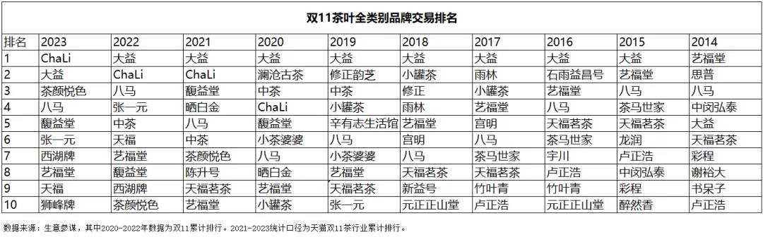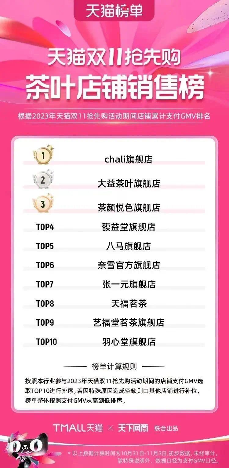 来源于数据参谋的统计,茶叶前十品牌中,蝉联天猫双11八连冠的大益被Chali挤下宝座,以袋泡茶出圈的茶里首次荣登第一;新茶饮品牌茶颜悦色杀入前三;八马第四;馥益堂第五、张一元第六、西湖牌第七、艺福堂第八、天福第九,狮峰牌则首次挤进前十榜单,位列第十。 预售的时候chali占了第一,累计的时候却从榜十里面跌出,大益保住了第一,保住了九连冠军,也算是值得祝贺🥳