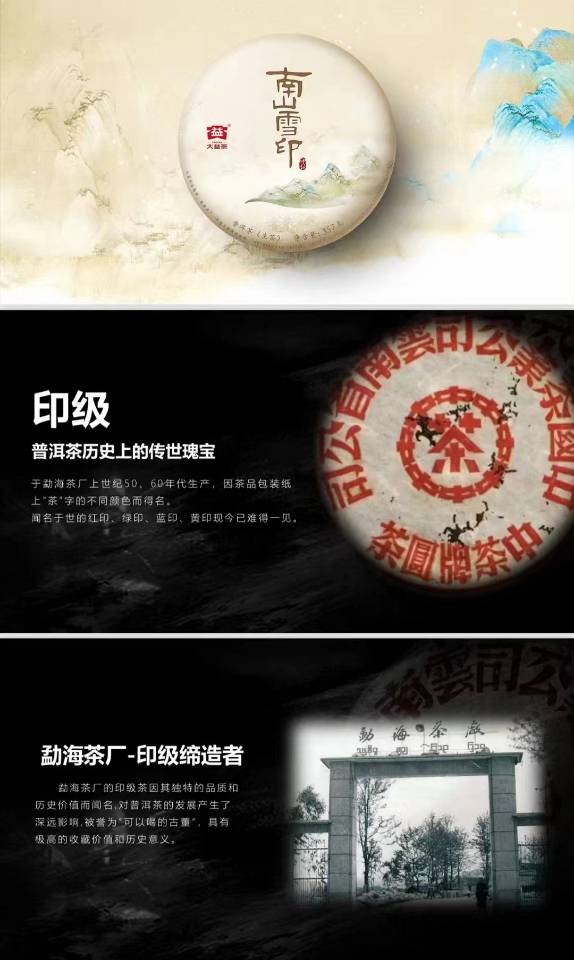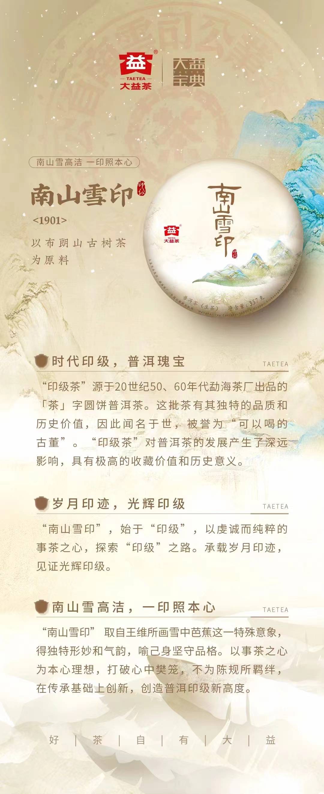 大益重磅新品南山雪印的爆发力超强! ✨时间🕙的价值之“印级系列”🍃 香港仕宏2023秋拍:五十年代“金山楼”收藏无纸红印,以330万落槌;原筒五十年代 蓝印铁饼,以238万落槌价;一片五十年代红印青饼,干仓以75万落槌价。 以上印级茶品都是勐海茶厂生产的老茶!🌳 @时代印级~普洱瑰宝🌿 大益重磅新品南山雪印传承印级高贵血统,呈现辉煌。让现在买进收藏的客户一起见证收藏大益茶的喜悦,所带来的财富。