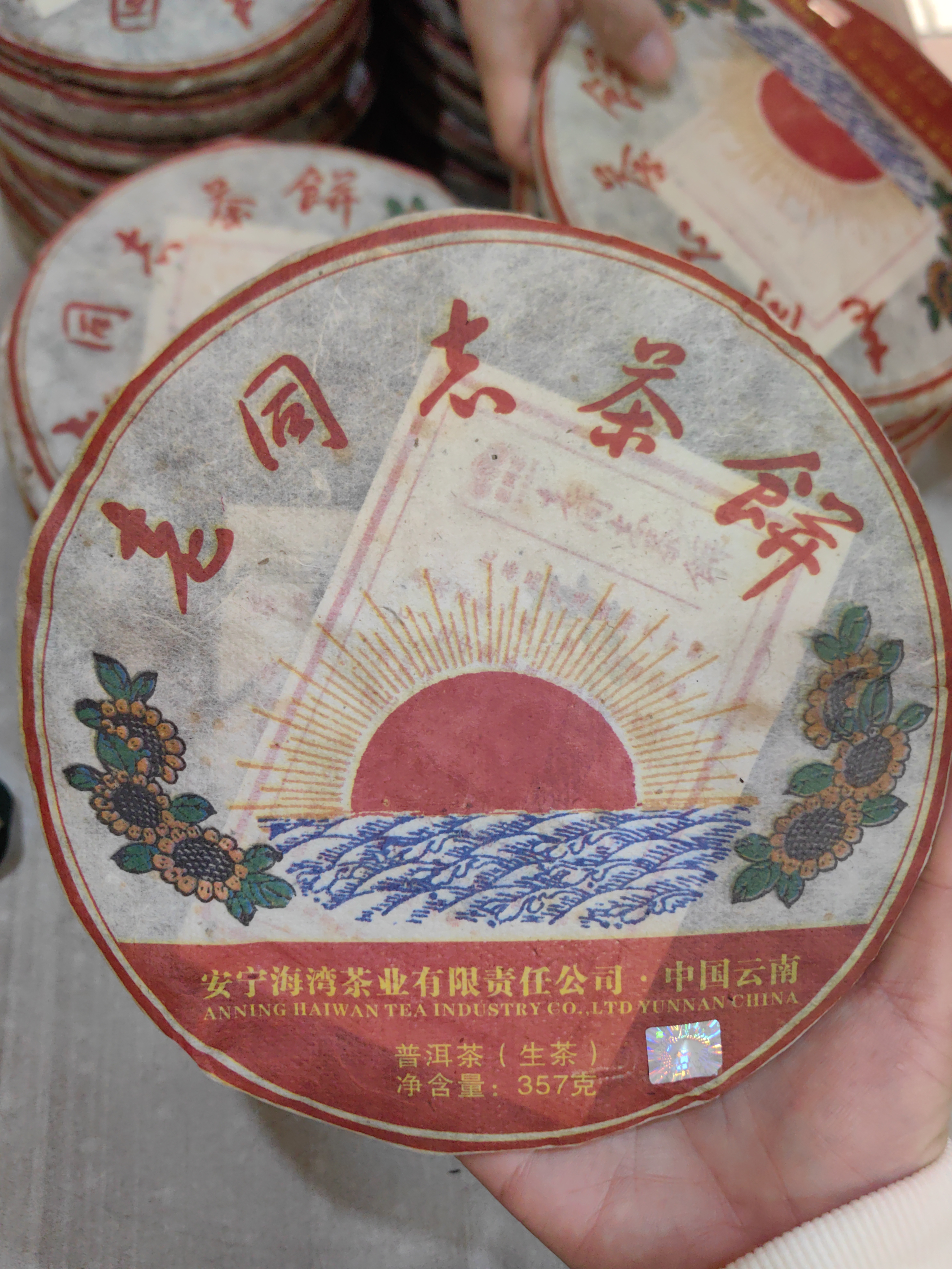 10年老同志红太阳茶饼 不签名版(整件出) 续2002年海湾茶业推出老同志红太阳茶砖,市场一砖难求,更显弥足珍贵 2010年海湾茶业按原经典配方,由中国普洱茶终身成就大师邹炳良厂长亲自精心调配而成,经一至三年藏于海湾茶厂专用自然陈化仓库 仅此一批,更显珍贵
