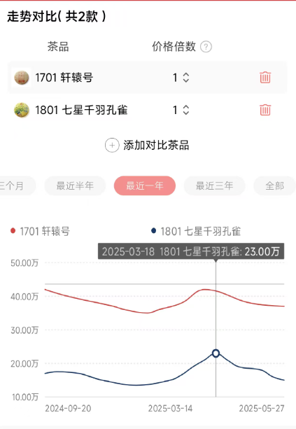 1701 轩辕号的价格走势堪称普洱茶收藏市场的教科书案例。其发行价仅为3万元/件,根据市场数据,轩辕号在半年内就从3万涨到20万,随后一路飙升。到2025年3月,其价格甚至一度被炒到近200万元/件,创造了普洱茶市场的价格神话。即使是在市场回调期,轩辕号的价格仍然稳定在高位。截至目前,行情价仍达37万元/件,虽然较最高点有所回落,但相比发行价涨幅依然惊人。 为了更全面了解轩辕号的市场地位,我们可以将其与另外一款大益明星产品——1801七星千羽孔雀进行对比。 千羽孔雀同样是大益的高端茶品,配货量约5500件,比轩辕号的2800件多出近一倍。截至2025年8月18日,千羽孔雀的行情价为15万元/件,远低于轩辕号的42万元/件。 从价格波动来看,千羽孔雀也表现出较大的波动性。从2024年11月到2025年8月,其价格从17.5万元/件跌至15万元/件,跌幅约为14.2%。 相比之下,轩辕号在同期的价格表现更为稳定,显示出了更强的抗跌能力和市场认可度。 从收藏价值来看: 目前的普洱茶市场的逐渐成熟和消费者对高品质普洱茶的需求增加,对于发行量稀缺(2800件),品质卓越,且文化价值加持的轩辕号来说,其价格波动直接影响整个大盘走势,并且这样强大的金融属性吸引了不少投资者入场,进一步推高了其价格。相比其他高端茶,轩辕号的收藏价值一目了然,适合长期持有! 目前1701轩辕号的市场关注度一直居高不下。根据茶行业平台数据显示,近期有22565位茶友对该茶品感兴趣,121位茶友参与点评。这种高关注度保证了其市场流动性和价格稳定性。