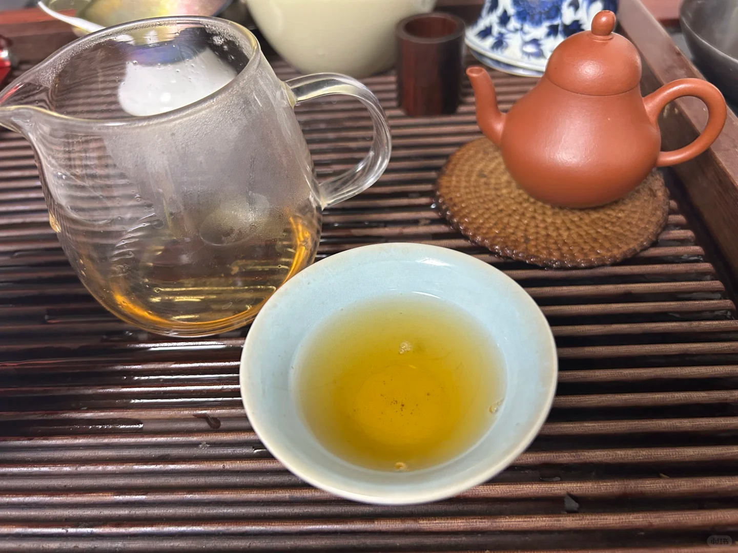 汤色浅黄较明亮,茶汤香为蜜香烟香,入口略浓带涩,微苦但化得快,回甘生津较好,舌尖处生津回甜明显,有陈年茶的陈化也有新茶的新涩感。