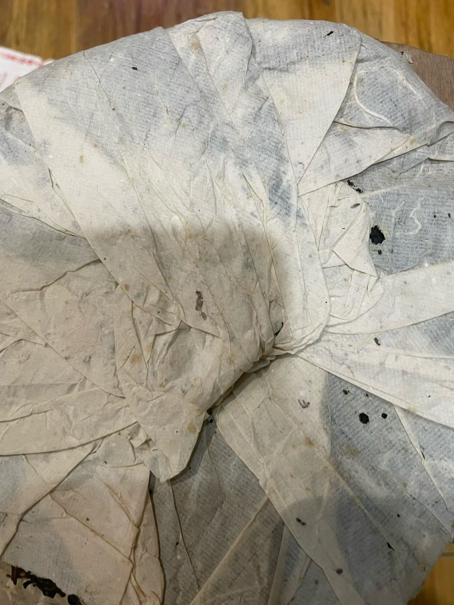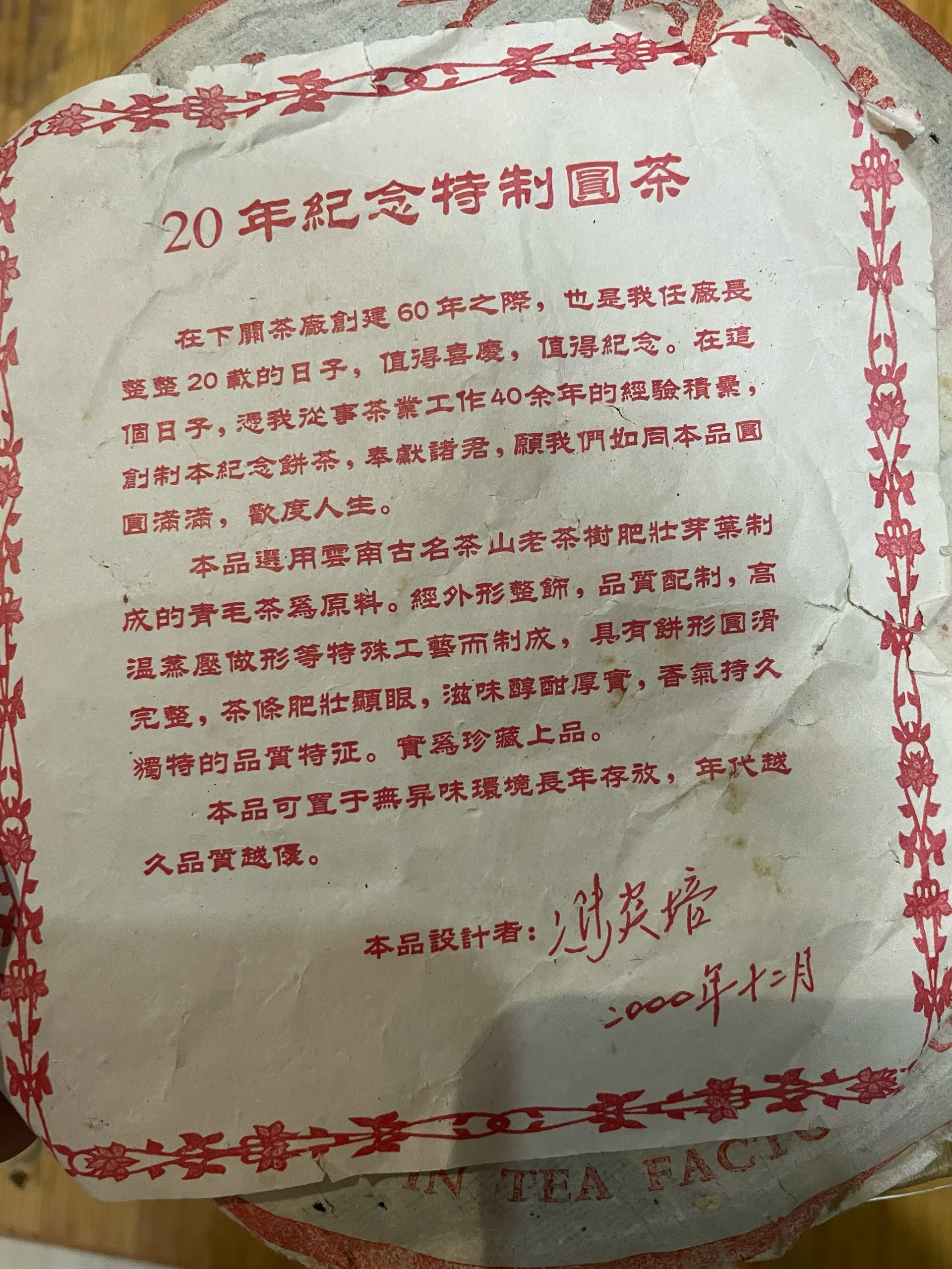下关•2000年•千禧红印 ,冯炎培纪念饼,淡淡烟香,以蜜香和复合型高香为主,茶汤由淡转深,汤色呈现迷人的完美的深橙红色,汤感厚重,挂杯香持续,口感饱满,先苦后甜,具备下关茶厂惯有的生茶的犀利气势,生津回甘力度强且迅速,平衡感极佳。很值得一试的一款老茶!