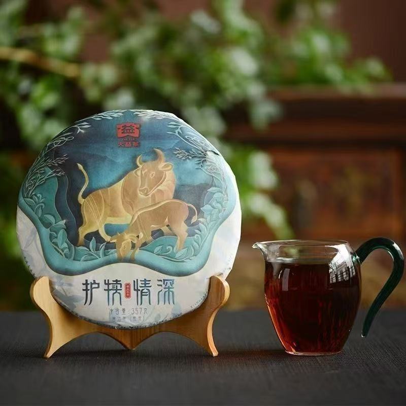 2101 护犊情深普洱茶精选云南勐海名山古树茶为原料,干茶饼形圆润饱满,条索紧结显毫,色泽褐红油润,叶底肥厚柔韧。汤色红浓透亮,香气醇和浓郁,初泡散发糖香与甜香交融,中段透出干果香与木质香,尾调萦绕丝丝蜜韵。滋味醇厚甘滑,入口柔顺细腻,茶汤稠厚如绸,回甘持久,喉韵清凉,兼具柔美与力量感。其特色在于以“母爱”为文化内核,通过精湛发酵工艺突出古树熟茶的温和底蕴,口感层次丰富,耐泡度高。作为大益生肖茶系列收官之作,护犊情深承载着“为母则刚”的精神寓意,在普洱茶界占据独特地位。当前行情稳中有升,兼具品饮与收藏价值,随时间转化潜力突出,是茶友珍藏的经典之选。