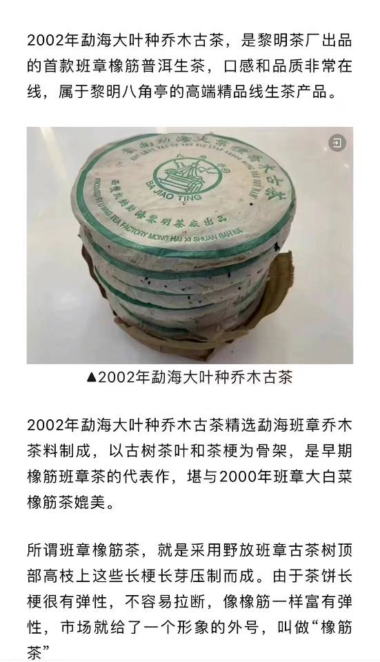 02年绿纸班章橡筋饼 原件原箱.357克/84片 广东干仓存放,爆烟香 黎明金字塔顶端品 茶汤自然烟香舒适,冲泡后条索粗壮显芽,茶汤饱满柔亮,口感霸气回甘,乔木韵明显,耐泡度高 总体口感风格较为猛烈霸气,经过二十多年的岁月沉淀,不输现在主流的白菜孔雀系列茶品,是一款不折不扣的顶级茶品