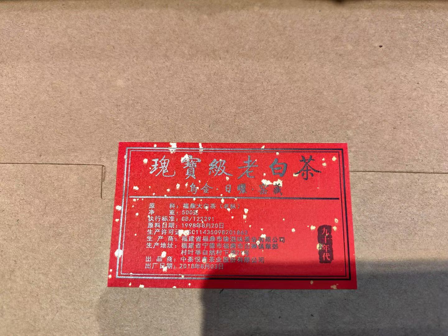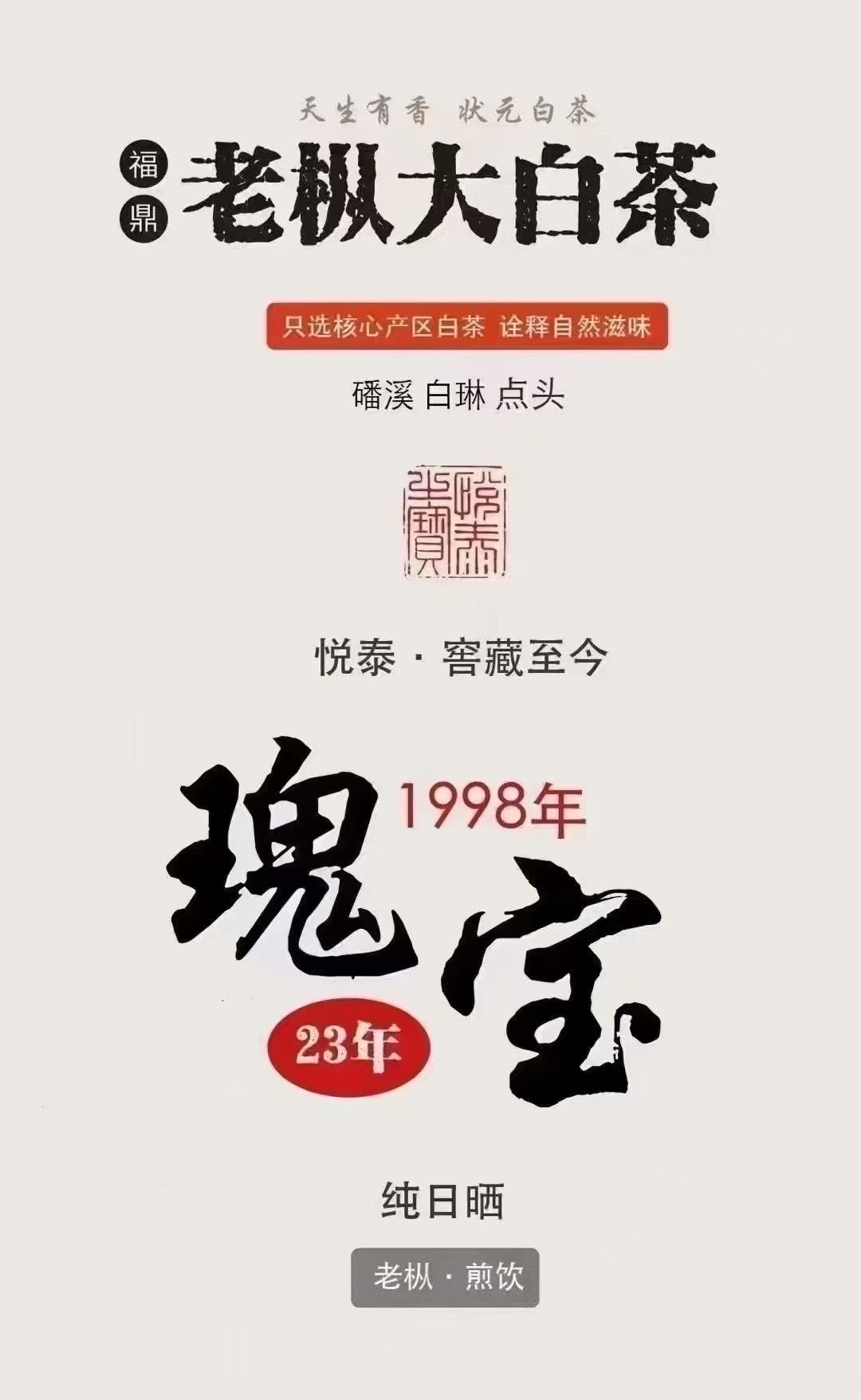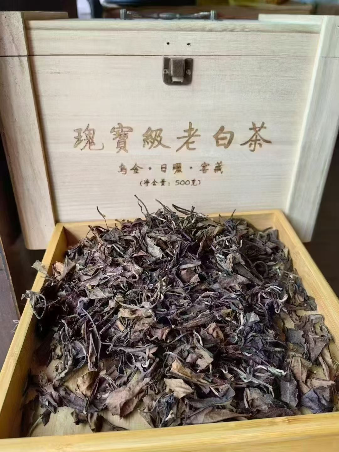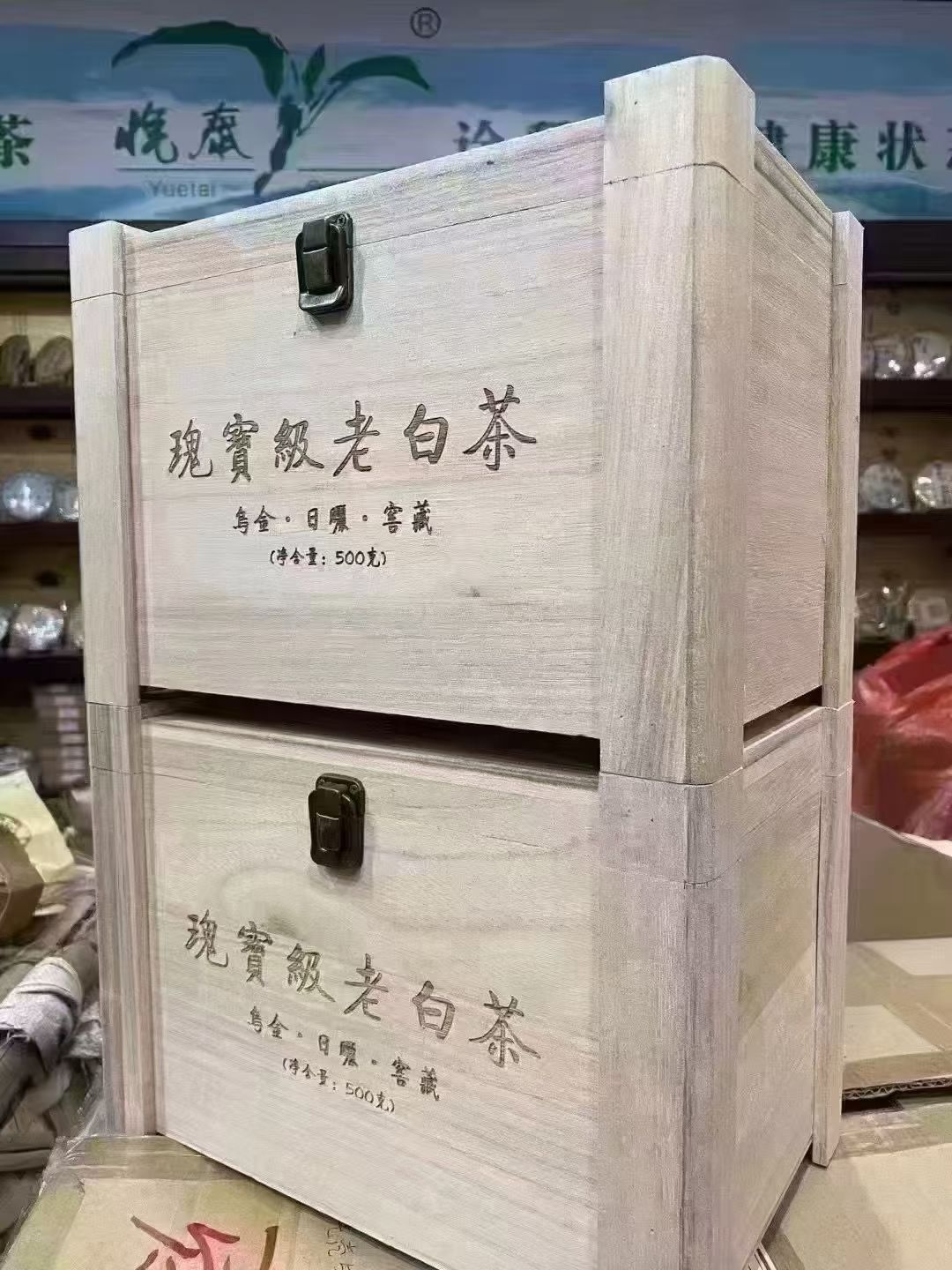 98悦泰老白茶木盒装~一斤一盒 选用福鼎市白琳镇翠郊村福鼎老枞大白茶。茶品干茶色若乌金且泛深黄,茶汤过喉,柔顺畅滑。茶味浓足,药香持久,甘随甜来,甜味化甘,生津不止,甘韵悠长。