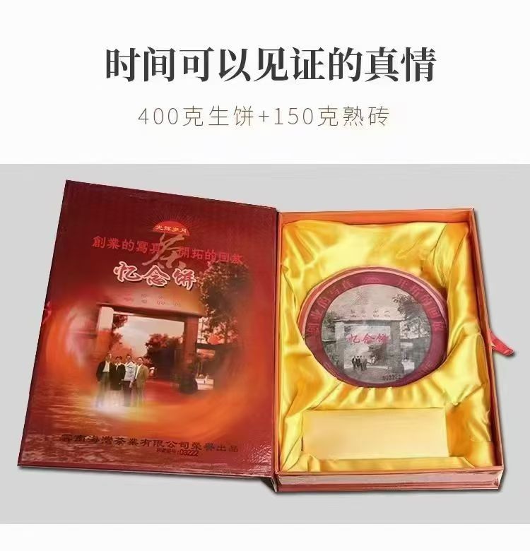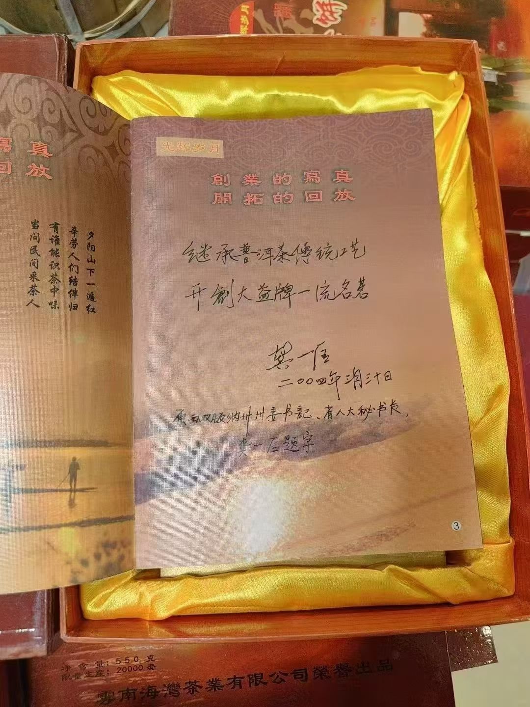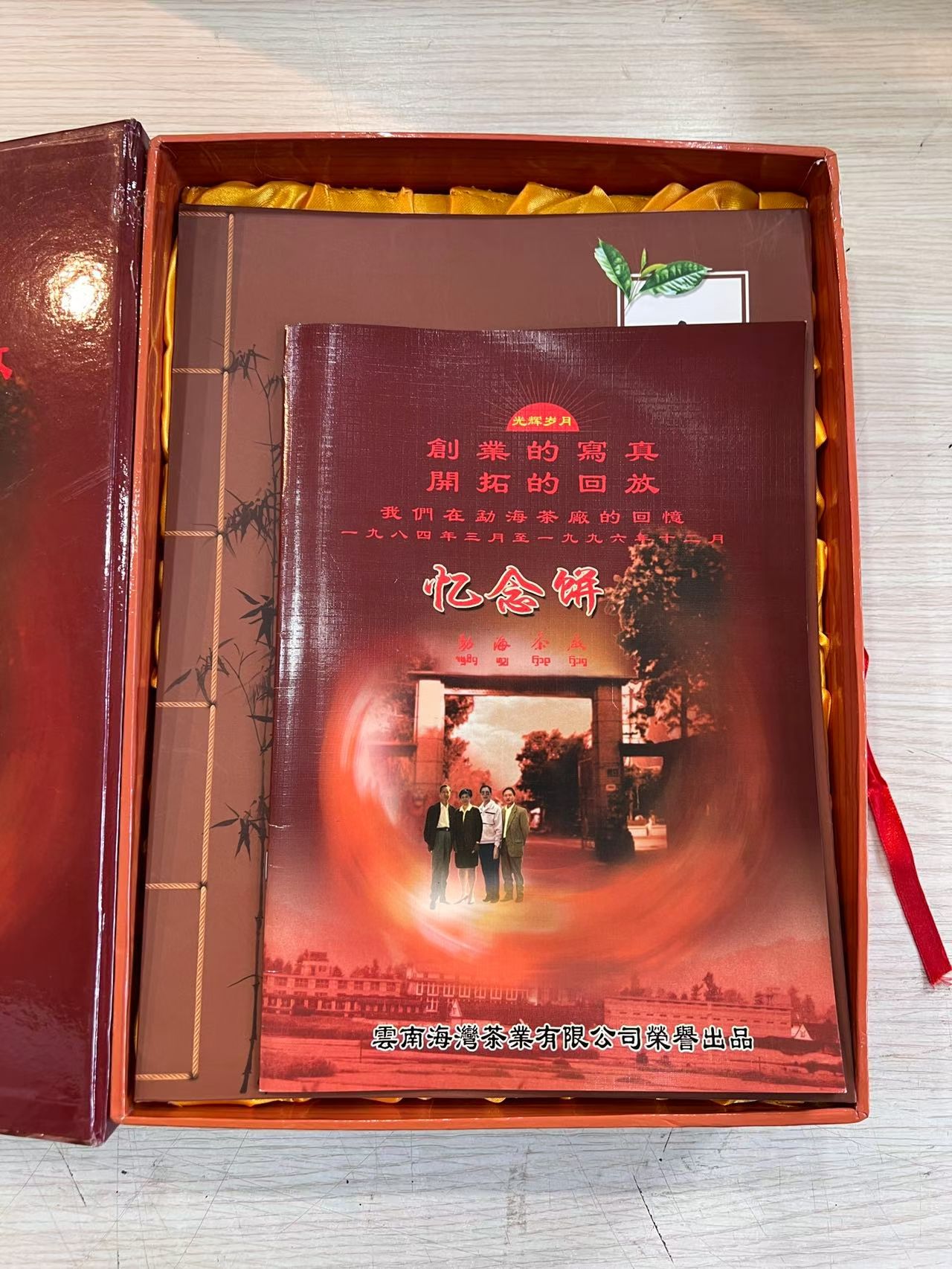 04年老同志忆念饼 创业写真·开拓回放 限量19988盒,邹炳良、卢国龄等1984-1996年在国营勐海茶厂创业、创立大益品牌的回忆作品。 据说此茶选用班章茶拼配,极高的品鉴价值,和收藏价值[鼓掌] 2004年 海湾茶厂 老同志 忆念饼签名版“忆念饼”见证了一代茶人邹炳良大师创业的写真,收藏价值极高!一饼一号,限量版礼盒装收藏臻品。班章料,海湾茶业邹炳良先生普洱茶创业群体心血凝炼,创业的写真,开拓的回放,和四位普洱茶“大益” 创建人邹炳良、余正才、卢国龄、卢云亲笔签名! 一件16盒