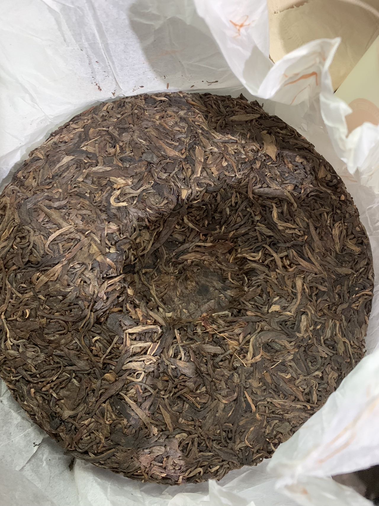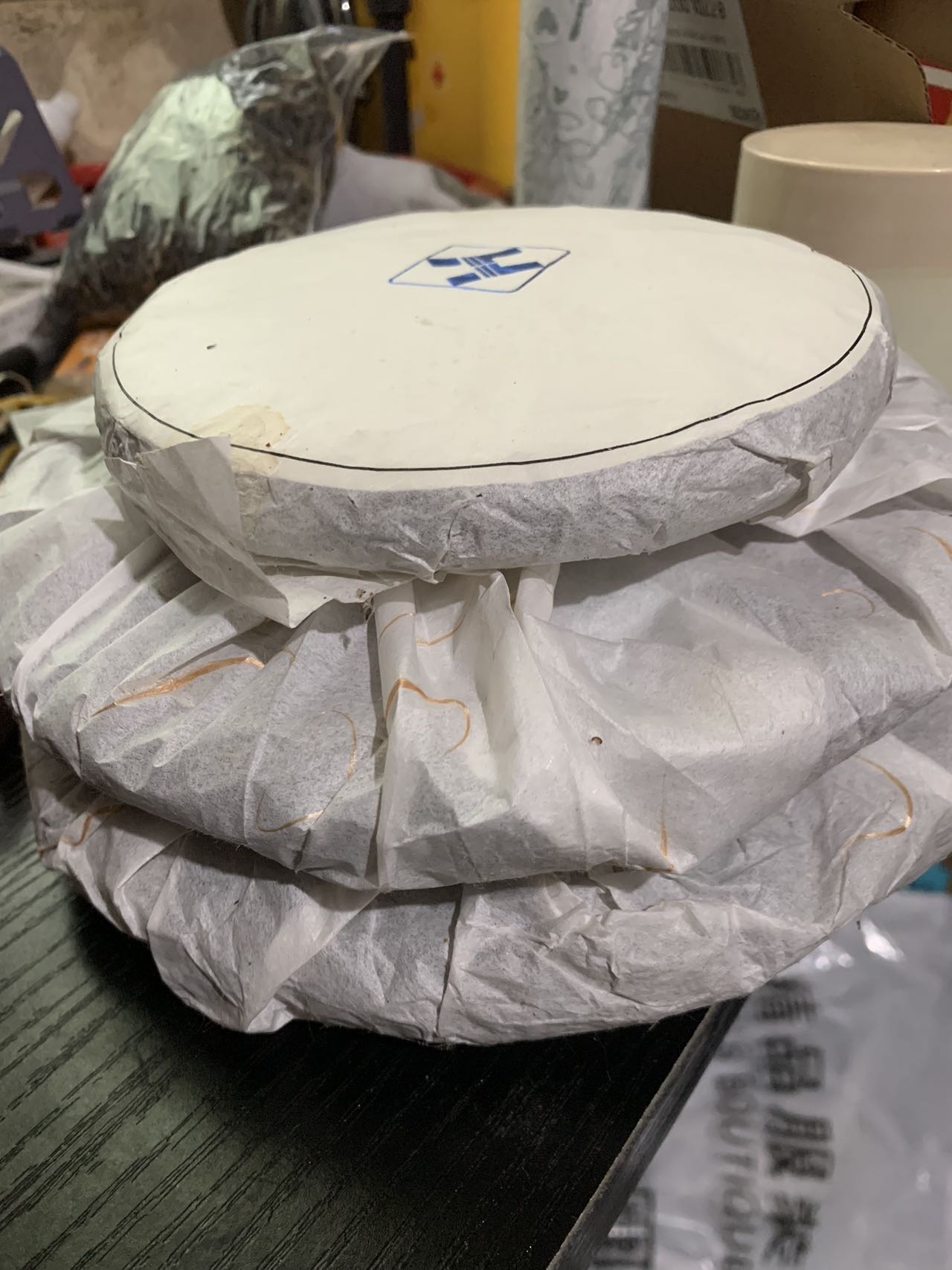 图一图二是同一饼茶,不知道是哪款,也不知道值不值钱,图四,图五分别是两饼,外壳也没有字,有没有知道的