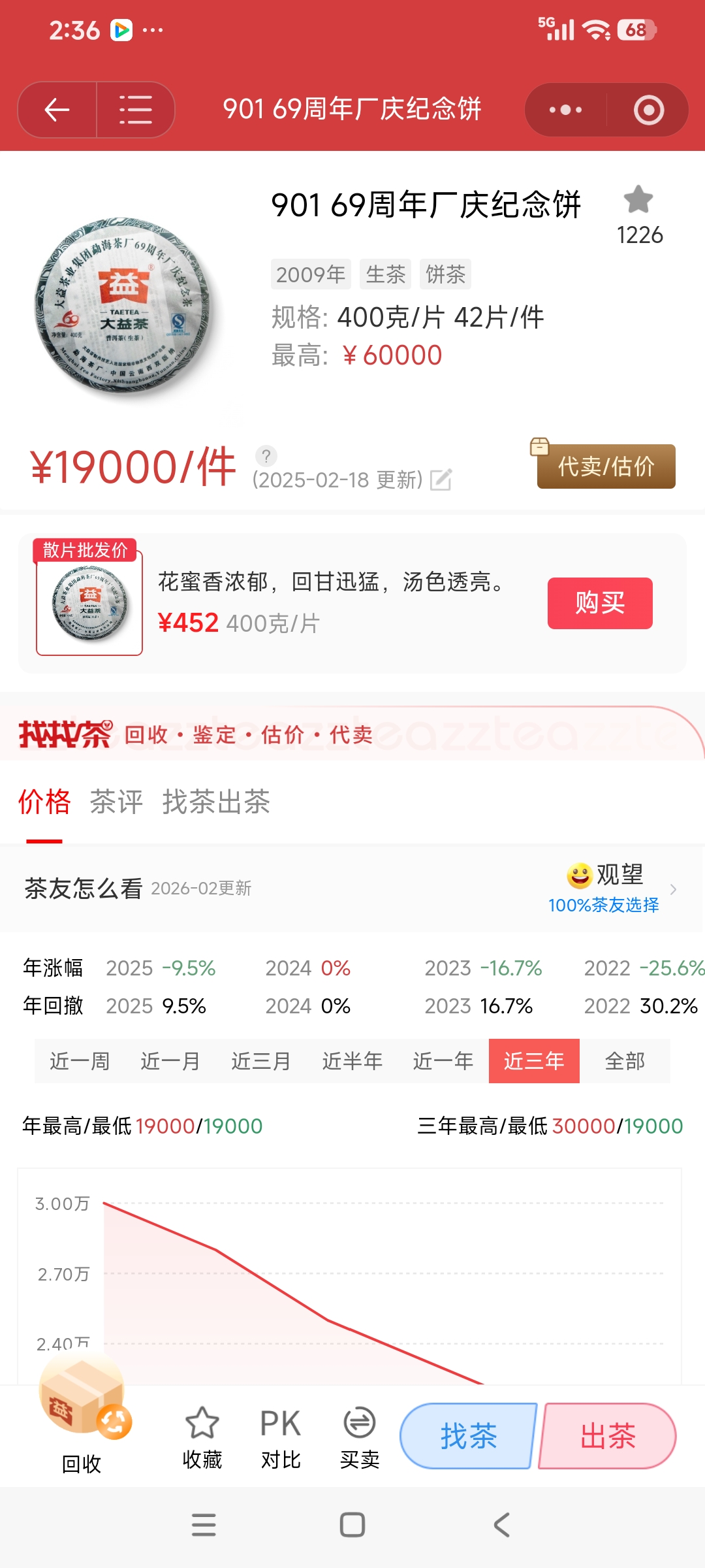 最高的时候这款茶到6万,又是到了品饮的价格了,非常好的品质,仓好就是不一样的,茶汤醇厚浓郁,蜜香高扬,爱喝好茶的伙伴们可以试试。